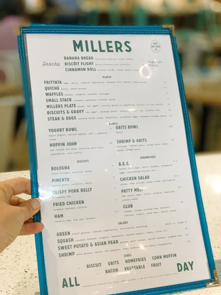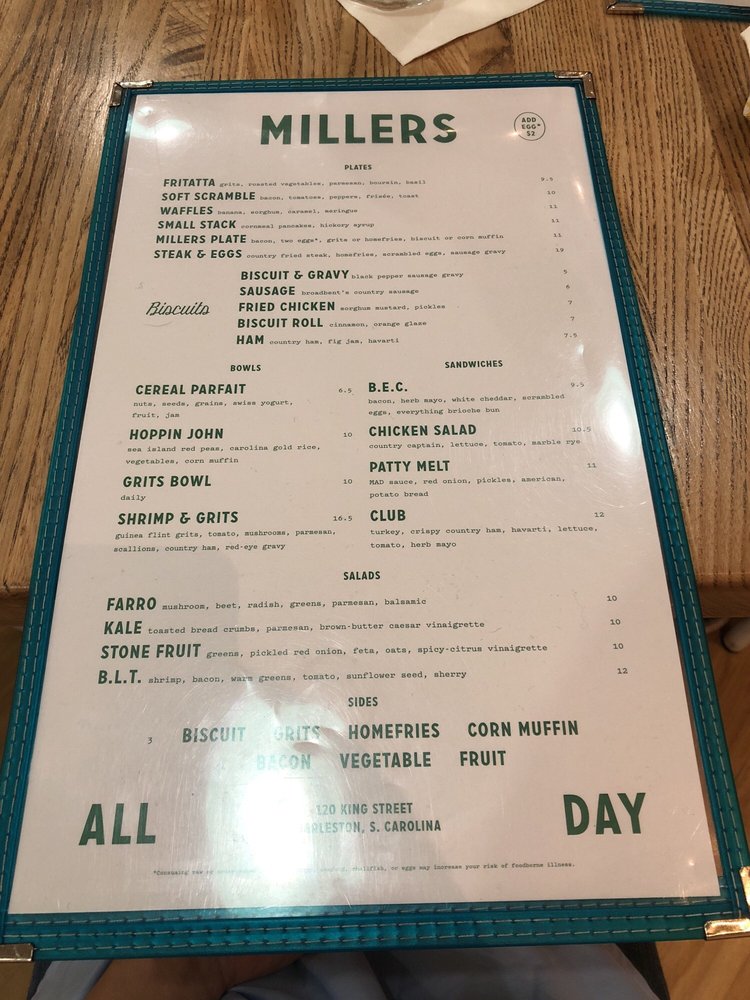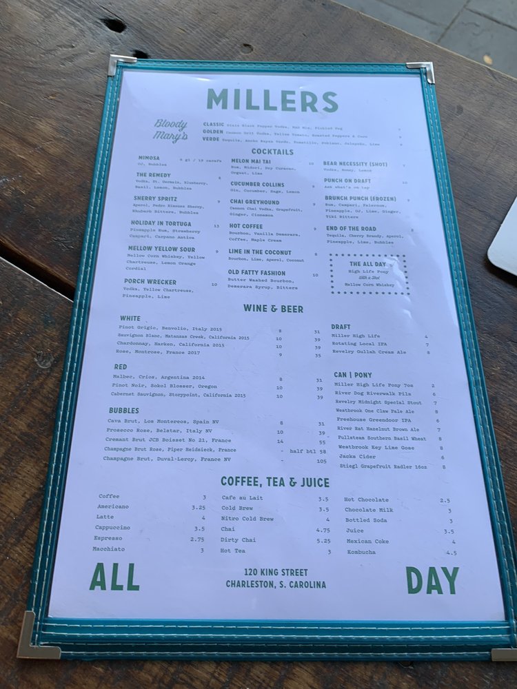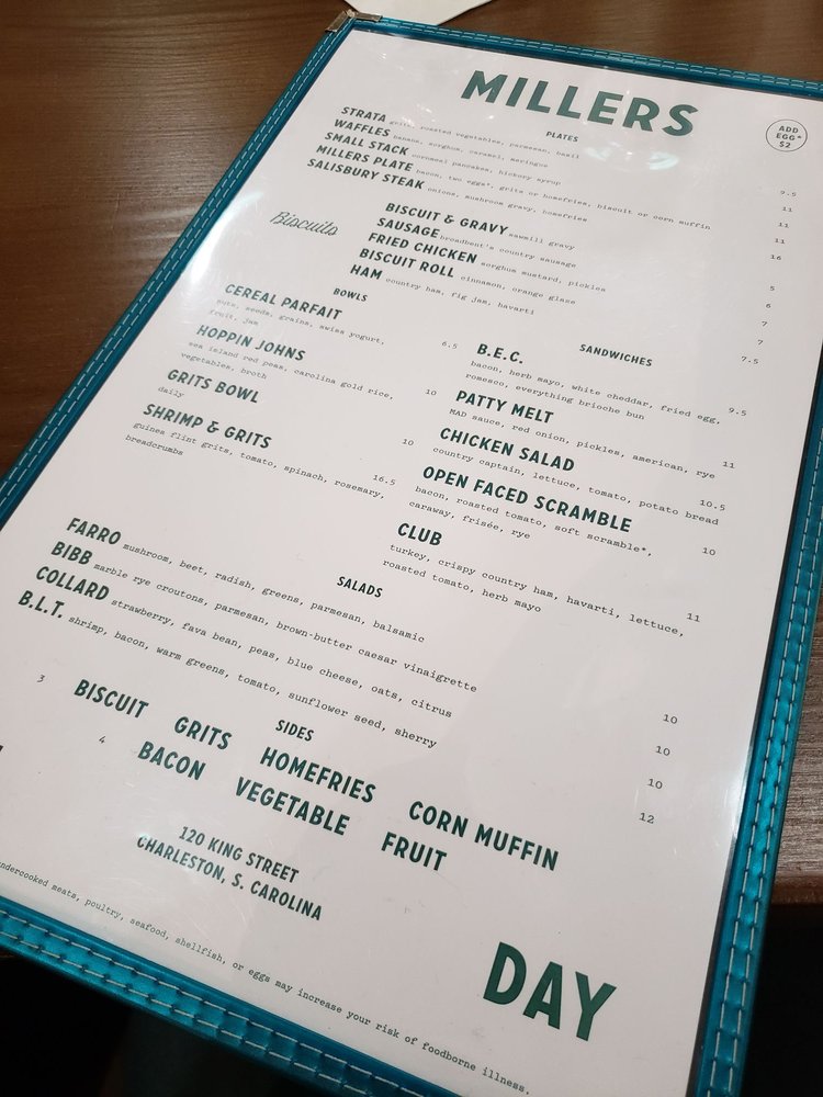 Millers All Day is a trendy and classy Southern restaurant located in Charleston, SC, offering a diverse menu for breakfast, brunch, lunch, and dessert. With options like Kale Salad with brown butter Caesar vinaigrette, Soft Scramble Plate with bacon and toast, and Ham Biscuits with fig jam, the food is flavorful and well-executed. Customers rave about the fried chicken, biscuits, and pimento cheese, highlighting the delicious flavors and generous portions. The restaurant's clean and modern ambiance, convenient location, and friendly staff make it a must-visit spot for a satisfying meal. Despite potential wait times, the quality of the food and service make Millers All Day worth the visit.
